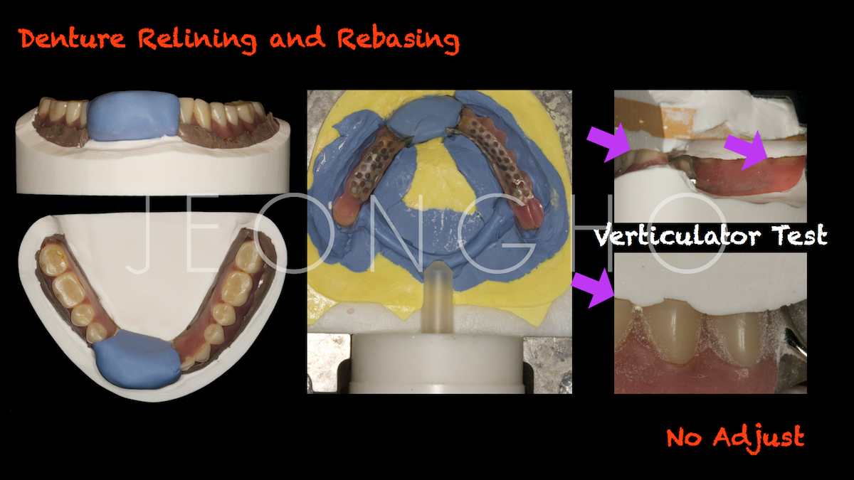 특히 partial denture에서 더욱 짜증이 나는 일인데요. pick-up impression이 아니경우 Denture만으로 rest seat의 확실한 접합이 되는지 알수 있는 방법이 없습니다. 편법을 이용하여 할 수도 있겠지만 스트레스 안 받고 하는 방법은 이것밖에 없네요. 물론 self curing 이나 cold curing으로 해결 할 수도 있겠죠. 하지만 환자를 위한다면 언제나~~~heat!!! 아래 사진은 verticulator에 마운팅후 cured 직후 본것입니다. 물론 환자 구강에서 교합조절은 없었습니다.